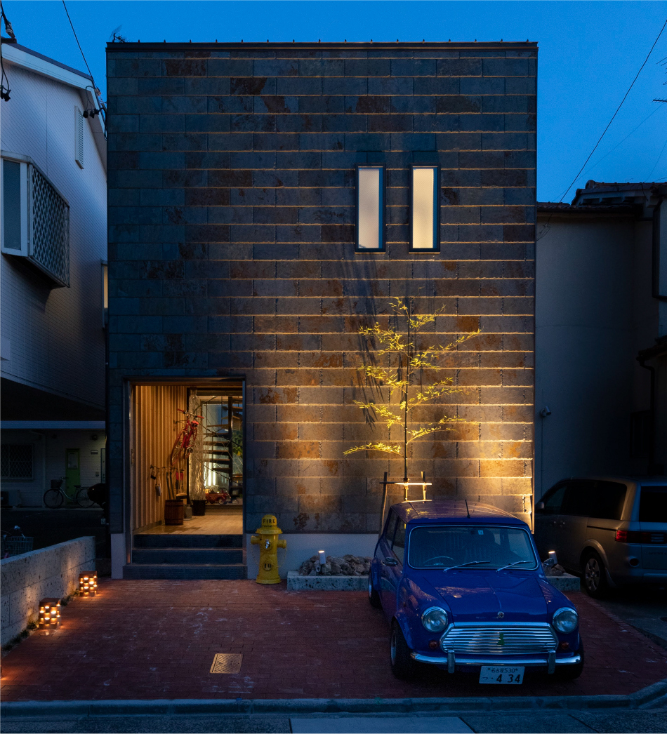 外壁はグレーと黒で張り分け、上を濃い色にすることで建物の存在感を強めました。